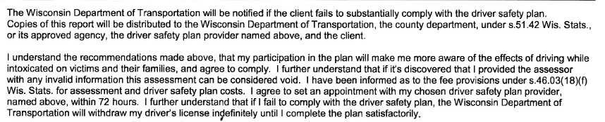 I understand the recommendations made above, that my participation in the plan will make me more aware of the effects of driving while intoxicated on victims and their families, and agree to comply. I further understand that if it’s discovered that I provided the assessor with any invalid information this assessment can be considered void. I have been informed as to the fee provisions under s.46.03(18)(f) Wis. Stats. For assessment and driver safety plan costs. I agree to set an appointment with my chosen driver safety plan provider, named above, within 72 hours. I further understand that if I fail to comply with the driver safety plan, the Wisconsin Department of Transportation will withdraw my driver’s license indefinitely until I complete the plan satisfactorily.”