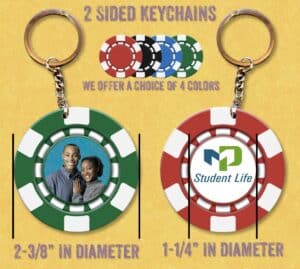 The perfect keepsake to remember your casino day! Get your photo and school logo on a double-sided Poker Chip Keychain. Available in a variety of colors, and with a photographer on site, Coyote on Campus does all the hard work for you!