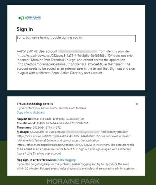 This error occurs when you are logged in to Office365 with your personal account and attempting to access a Moraine Park site that require you to be logged in with your MPTC student account. To fix this, you have a couple of different options: