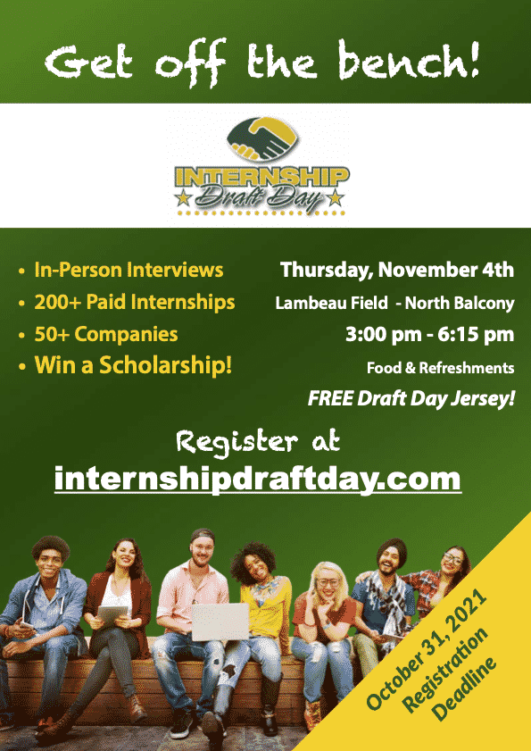 Get off the bench and attend Internship Draft Day at Lambeau Field- North Balcony on Thursday, November 4 from 3-6:15 p.m.